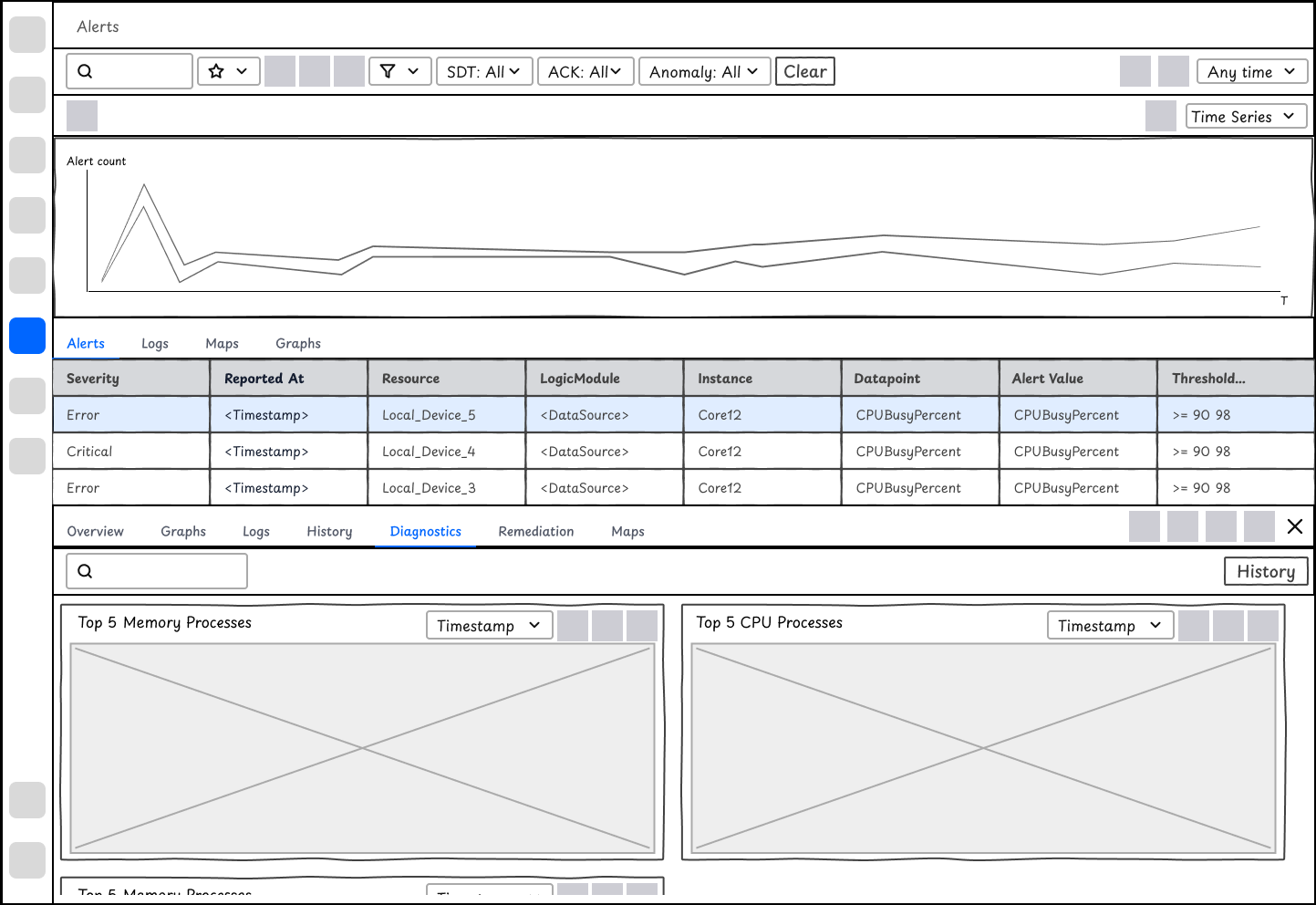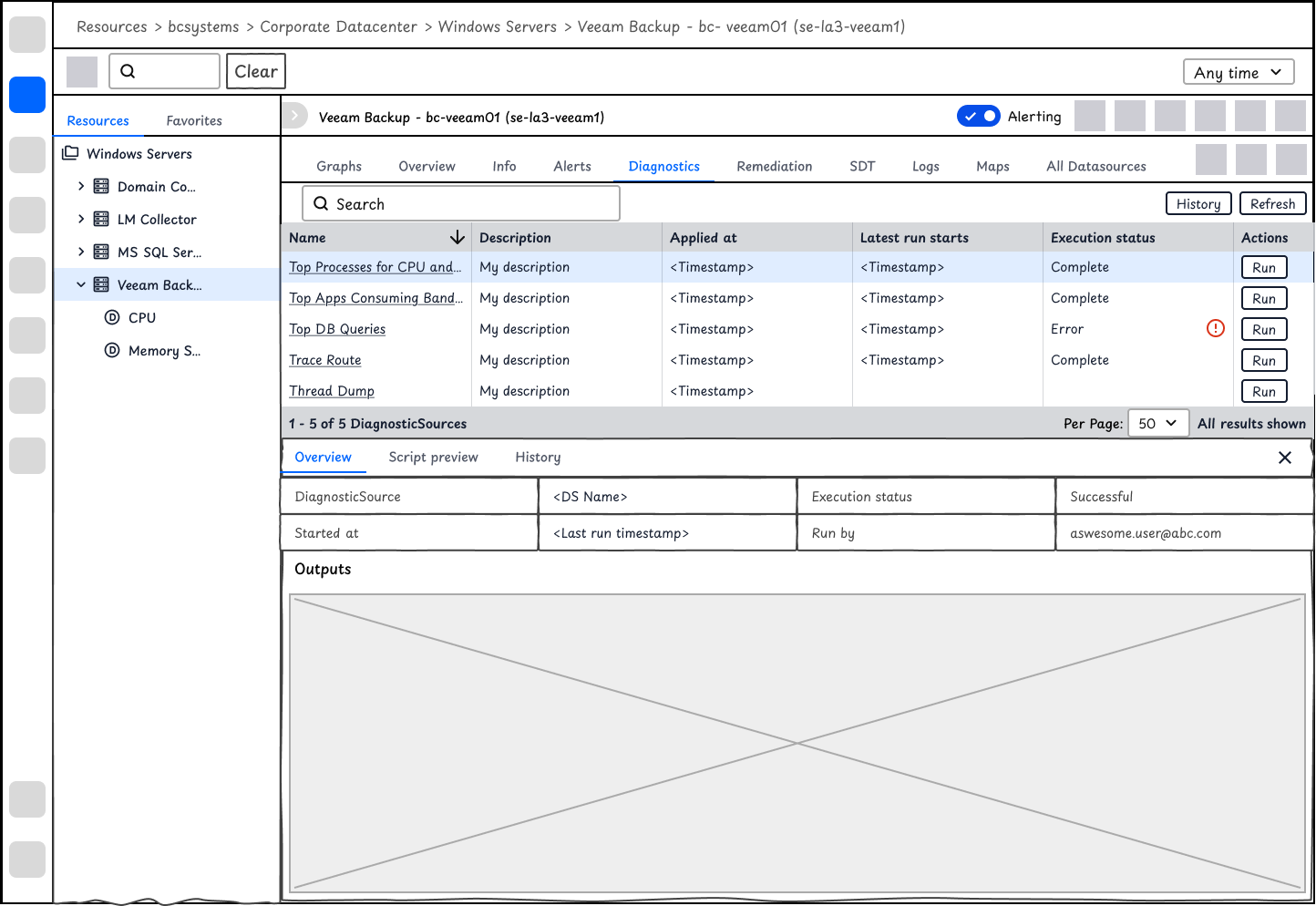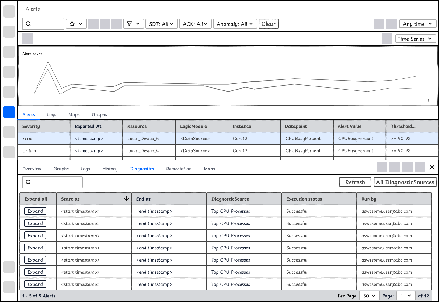 Users could view automated diagnostic outputs after they configured their Diagnostic and Remediation rules. Similar to Resources, Alerts has a complex information architecture. To give users what they want to see immediately, i.e. the diagnostic outputs at the time of alerts, the design is changed to tiles of widgets displaying the information that matters most to users, instead of a list of DiagnosticSources that require select, history, and view outputs among other steps for users to find the data.